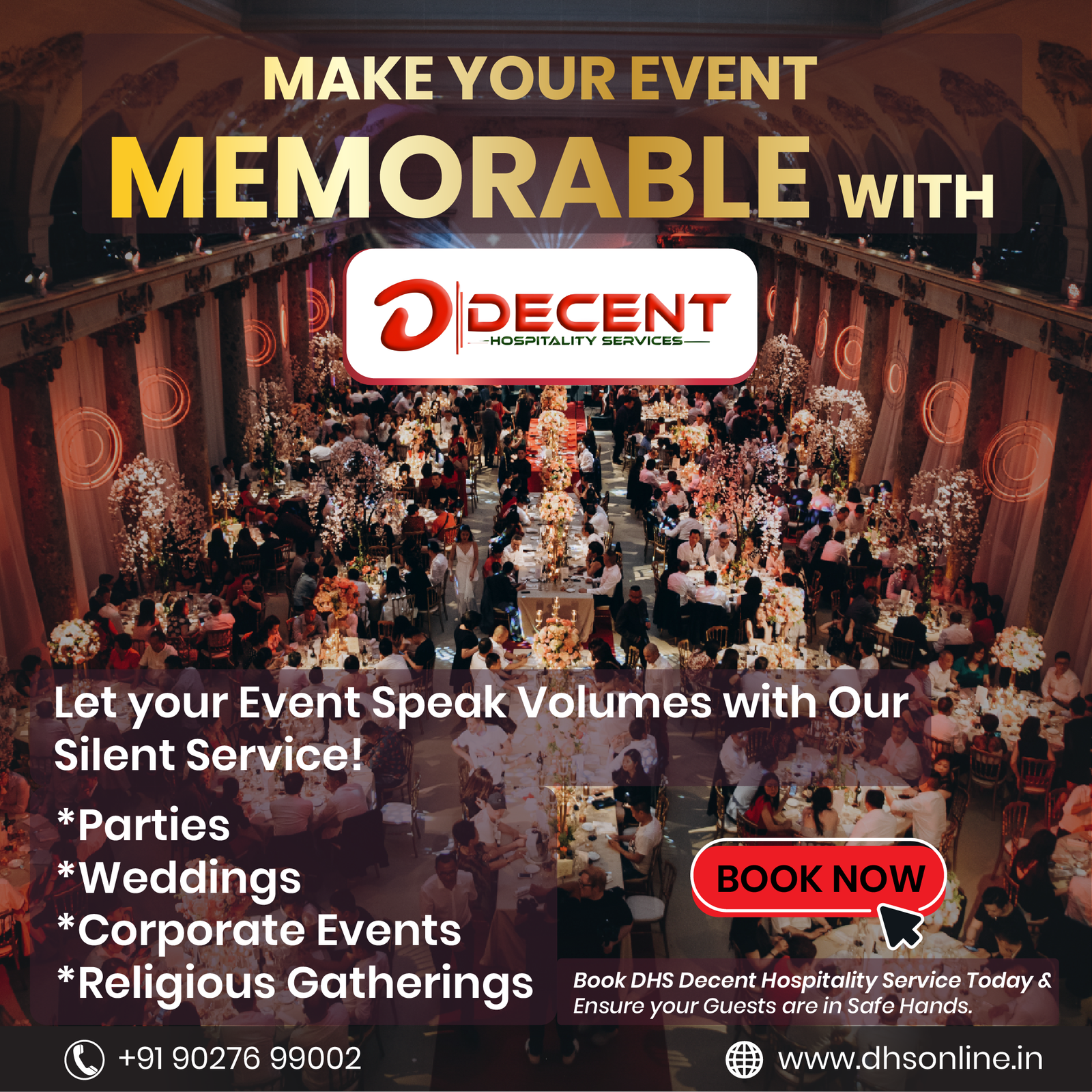 - Core Concept: “Let Your Event Speak Volumes with Our Silent Service” – highlighting DHS’s discreet yet impactful role.
