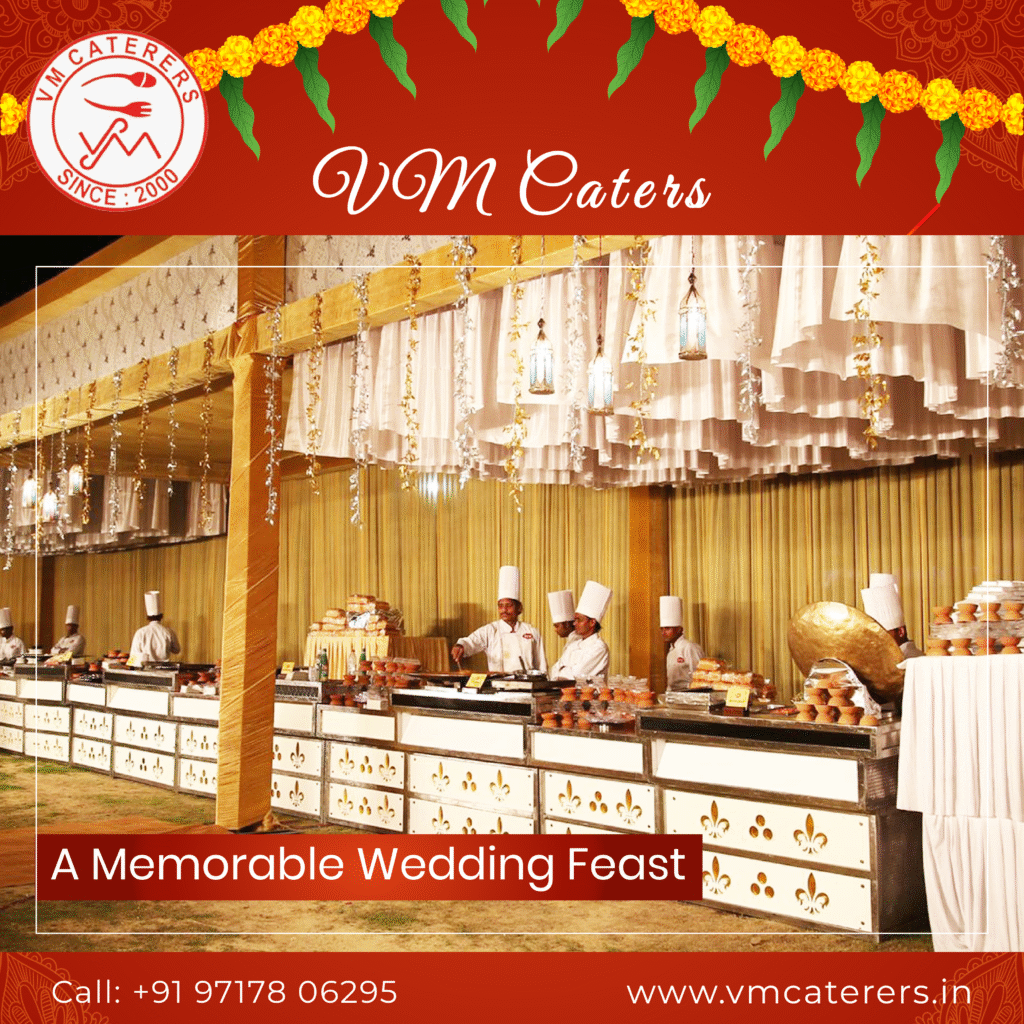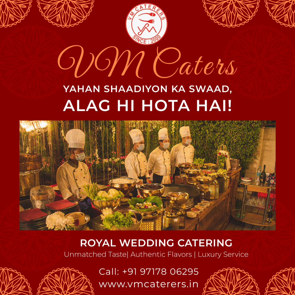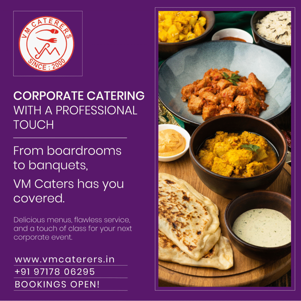 The bold headline, “Corporate Catering with a Professional Touch,” sets the tone, while the subtext reassures potential clients that VM Caterers can handle everything from boardrooms to banquets. The rich purple background adds a premium, elegant feel, making the gold and warm food tones pop.